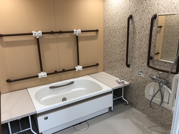 ↑浴室です。充分な広さのある個浴で、介護度に合わせてお手伝いさせてい頂きます。手すり、シャワーチェア、浴槽の補助台があり、どの方向からでも入水しやすくなっています。