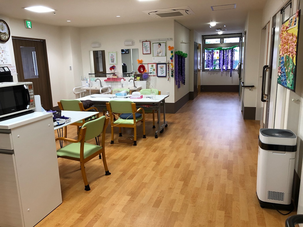 ↑居間 兼 食堂です。オープンキッチンスタイルで食事やおやつの準備をしながらでも入居者さんの見守りやコミュニケーションができます。