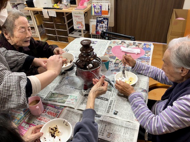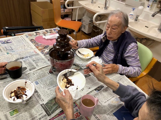 チョコレートファウンテンしました バレンタイン企画ということでチョコレートファウンテンなるものをしました。よくビュッフェとかのデザートコーナーにあるアレの家庭用サイズです(^^♪ したたり流れるチョコレートの光景におばあちゃんたちは、目を丸くしてましたが、すぐに「美味しそー」と楽しんでいました。 マシュマロや果物にチョコをつけて、いつものことながら皆さんペロリでした(^^)/