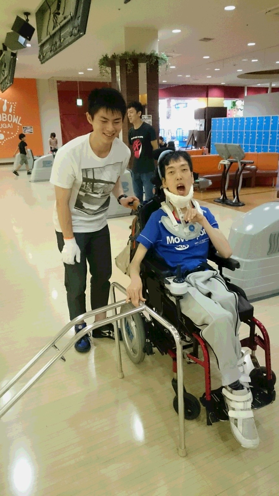 こちらのボーリング場、段差がほとんどないんですよね。歩いていたらそのままレーンといった感じで車いすメンバーにはとってもありがたいです。どこのレーンでも投げられます(^^♪