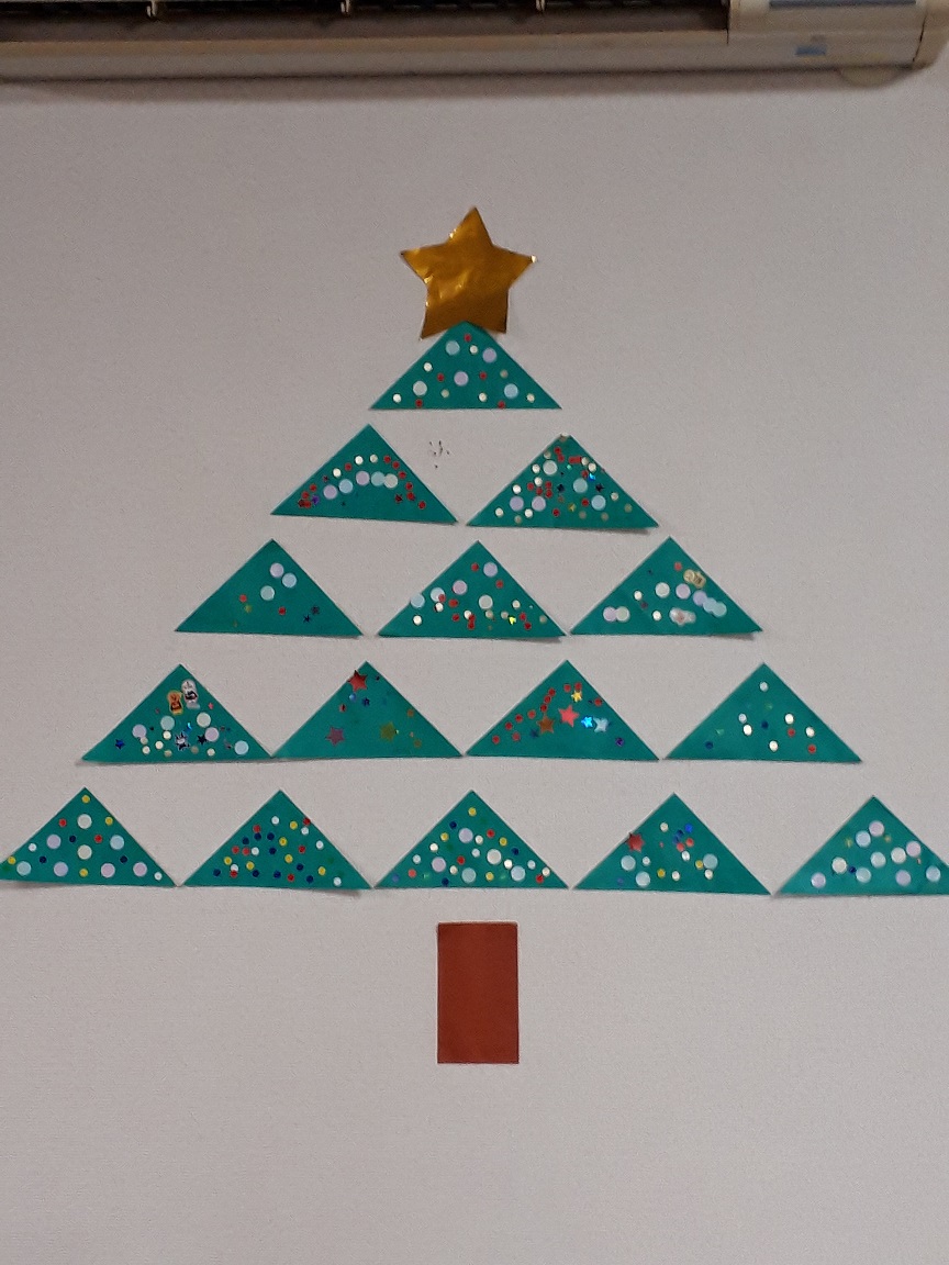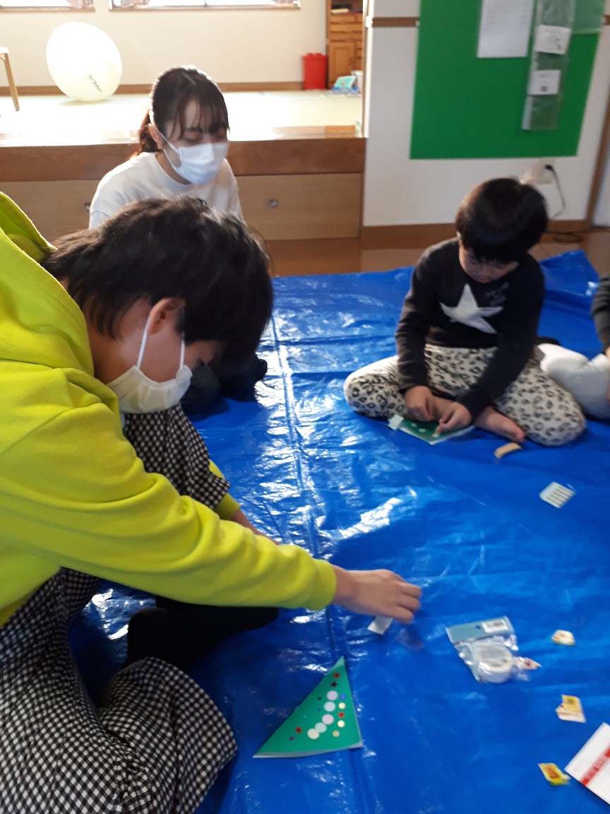 折り紙とシールを使って、みんなでクリスマスツリーの壁面飾りをつくりました! 細かいシールを好きなように貼りながら、手先を使って集中して取り組めていましたよ!(^^)!