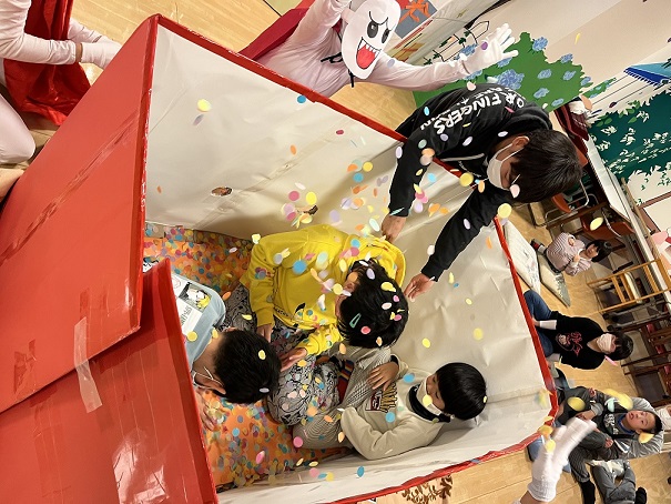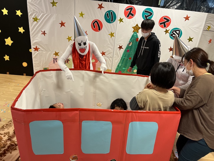 クリスマス会2022♡ 12月24日(土)にクリスマス会をする予定が、まさかの大雪で延期に… 26日(月)になんとか行うことができました! 日にち変更に合わせて協力してくれた、学生ボランティアサークルおでんのみなさんにも大感謝です!! 【おばけちゃん】のキャラクターのアトラクションや、光るツリー、光るポイの演目、お菓子の家…みんな目を輝かせていましたね!