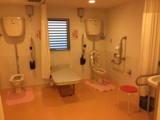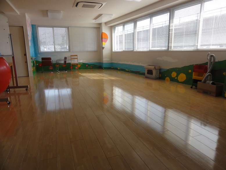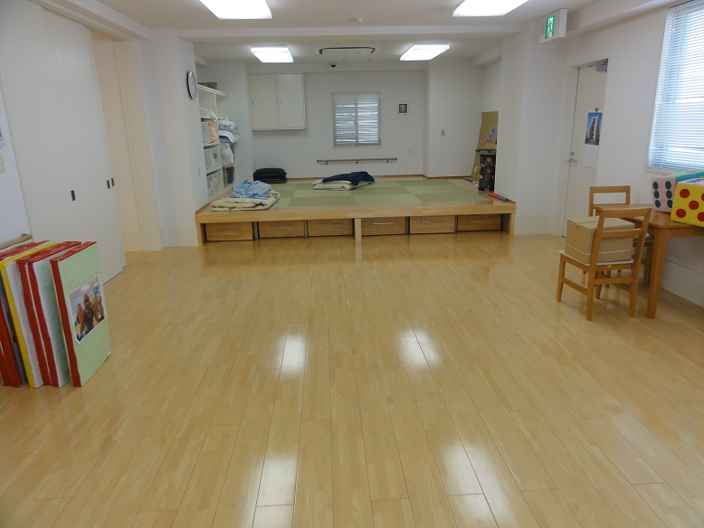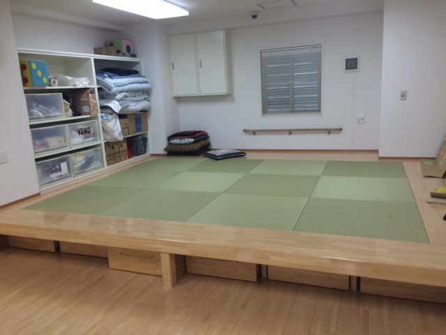 活動スペースには高床式の和室があります。完全バリアフリーではないの?と思われるかもしれませんが、この段差が、立ち上がりの練習や、起き上がりから座位姿勢をとったりと、大切な役割があるんです。
