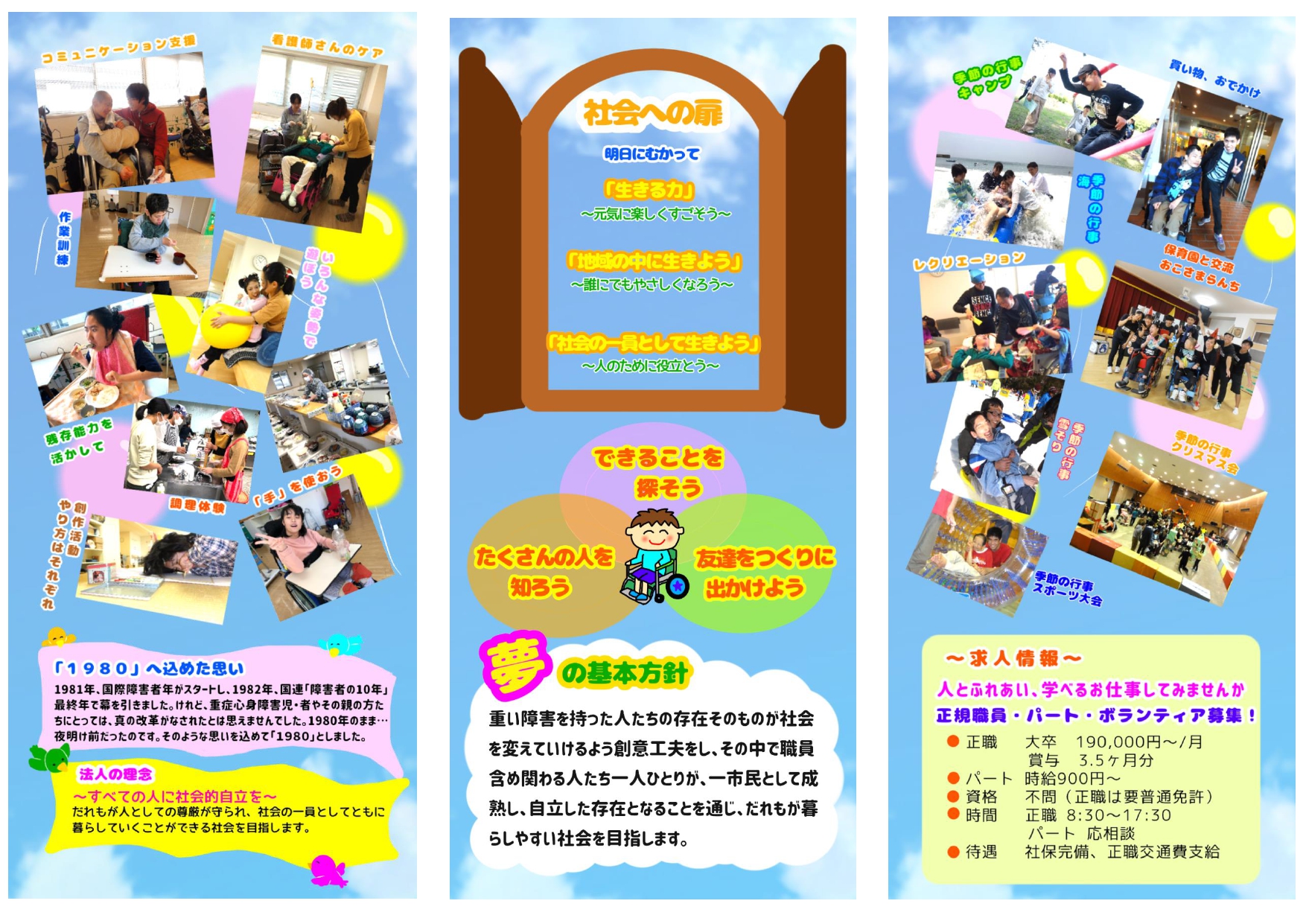 制度の上では「通所の施設」ですが、開所以来、私たちは「拠点」と呼んでいます。ここに通うメンバーがそれぞれに、楽しみや力をつけ、世界を広げ、ここから社会へ飛び立つ「拠点」でありたいという思いからです。