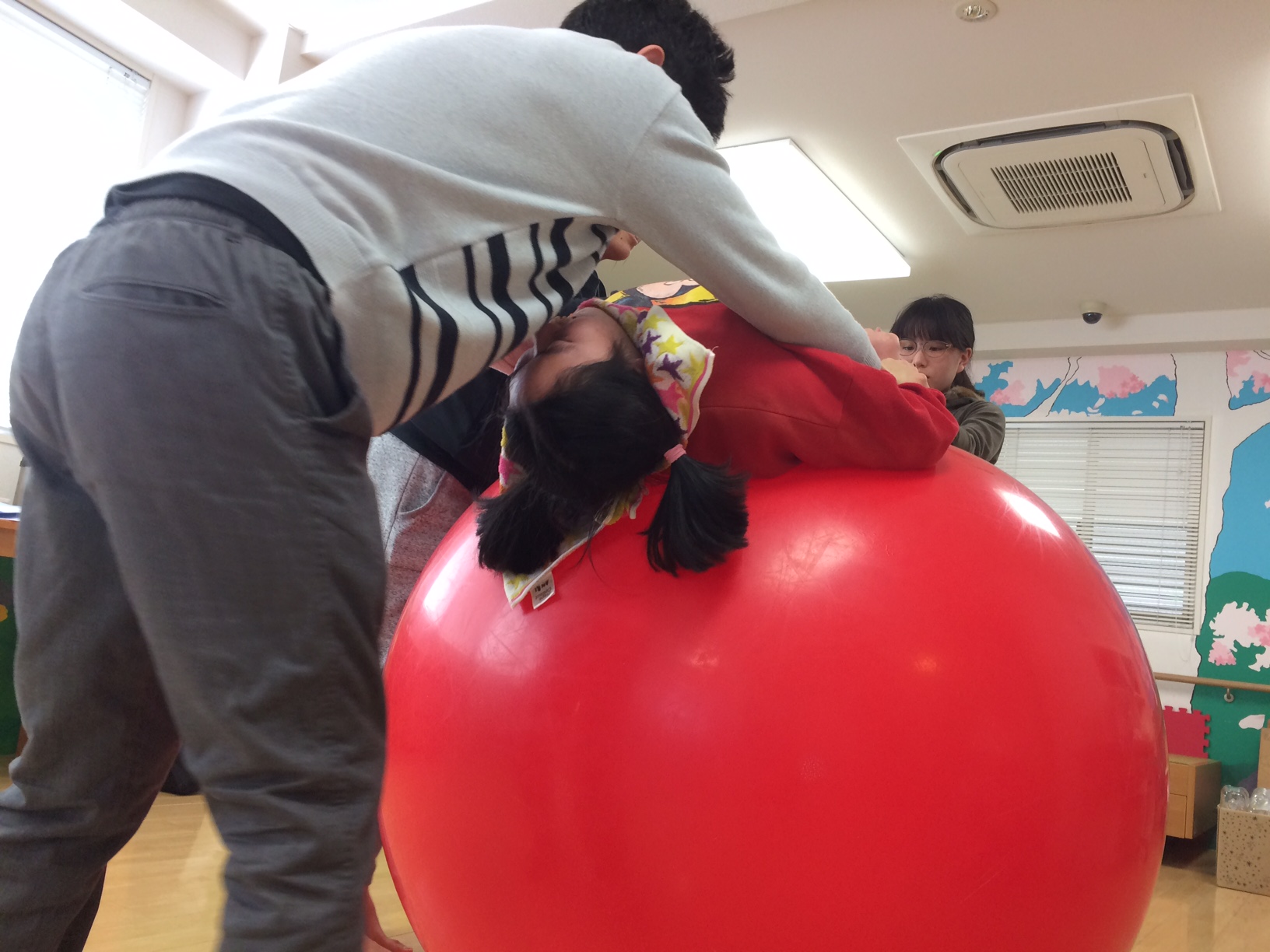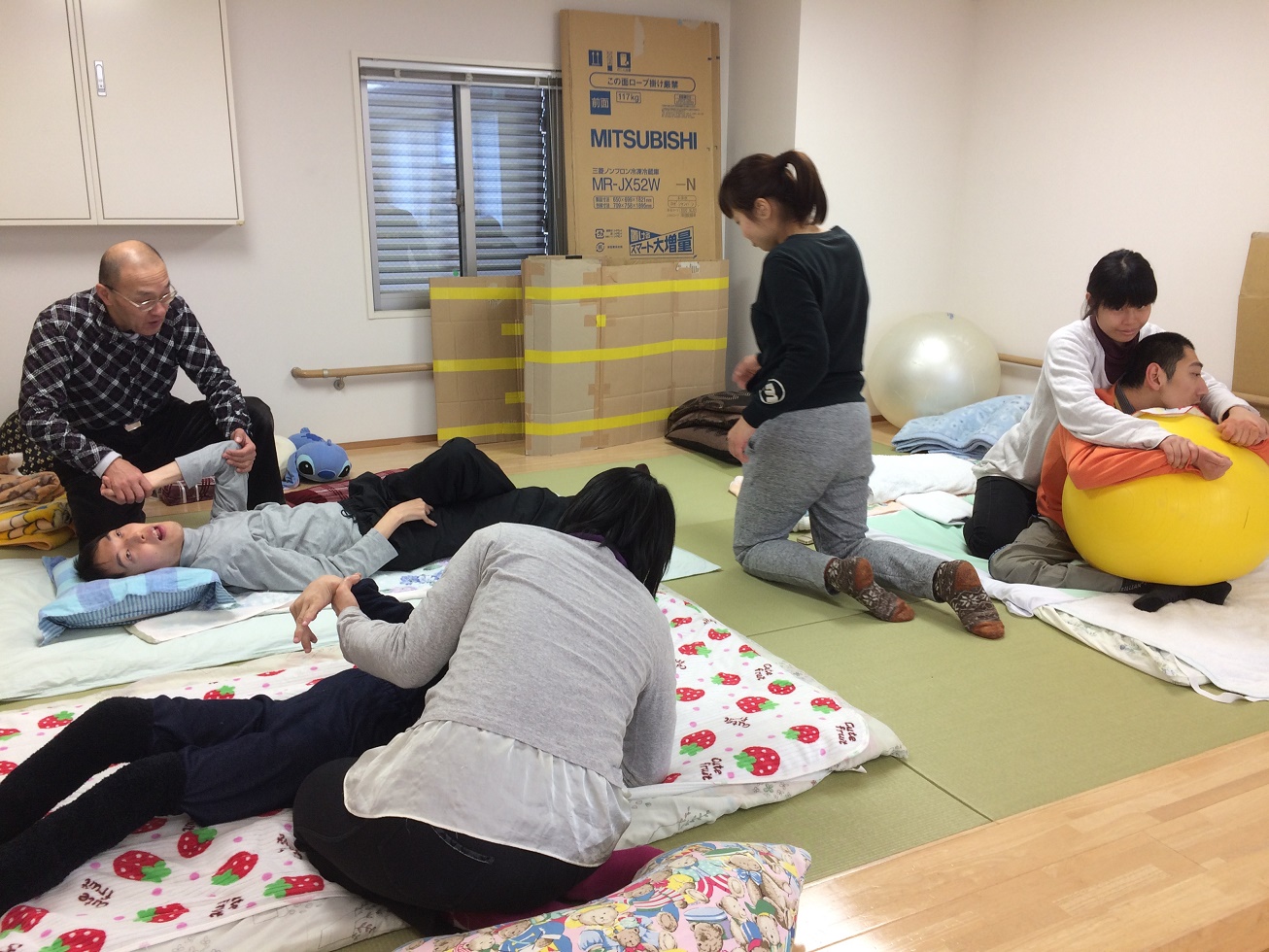 1人ひとりに合わせて身体を動かしていきます。マッサージをしたり、ストレッチをしたり、トレーニングボールに乗って自分の体重を利用してのストレッチや体幹トレーニング、歩行、四つ這いなどなど個々様々です。重い心身障害を持たれた方にとって毎日、できるだけ多くの時間をかけて誰かに体を「触ってもらう」ことはそれ自体コミュニケーションにつながりなりますし機能維持のためにもとても大事なことと考えています。おひるごはん